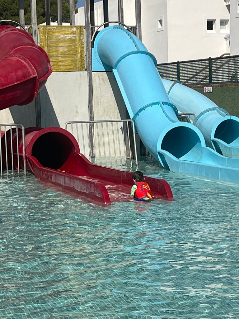 Breakfast was a civilised affair. Then, at 10:35, it was straight to the water park. The same security guard from yesterday spotted River and jokingly pretended it was closed. Sweet, but please don’t joke about closures with a child like River, you’re playing with fire. Luckily, he didn’t even notice and just strode right past to open the door himself.