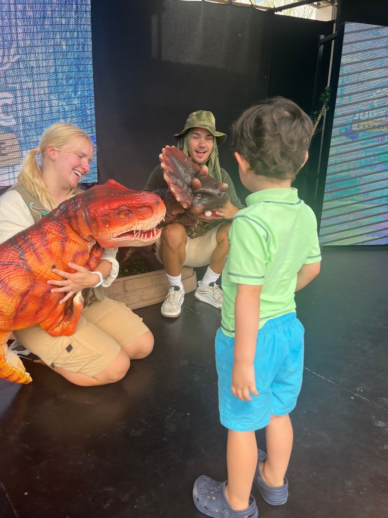 I reunited with the boys for the Dinosaur show. River is in his pushchair. He’s disregulated. He’s seeking familiar comfort. The beach morning has thrown him. River loved the show, it was just 2 of the entertainment crew dressed as explorers with a powerpoint type thing and again some kind of plot that I did not follow. But he loved it. My mum guilt was easing. Afterwards, you could meet the dinosaur puppets. Kike, without thinking, let River out of the pushchair.