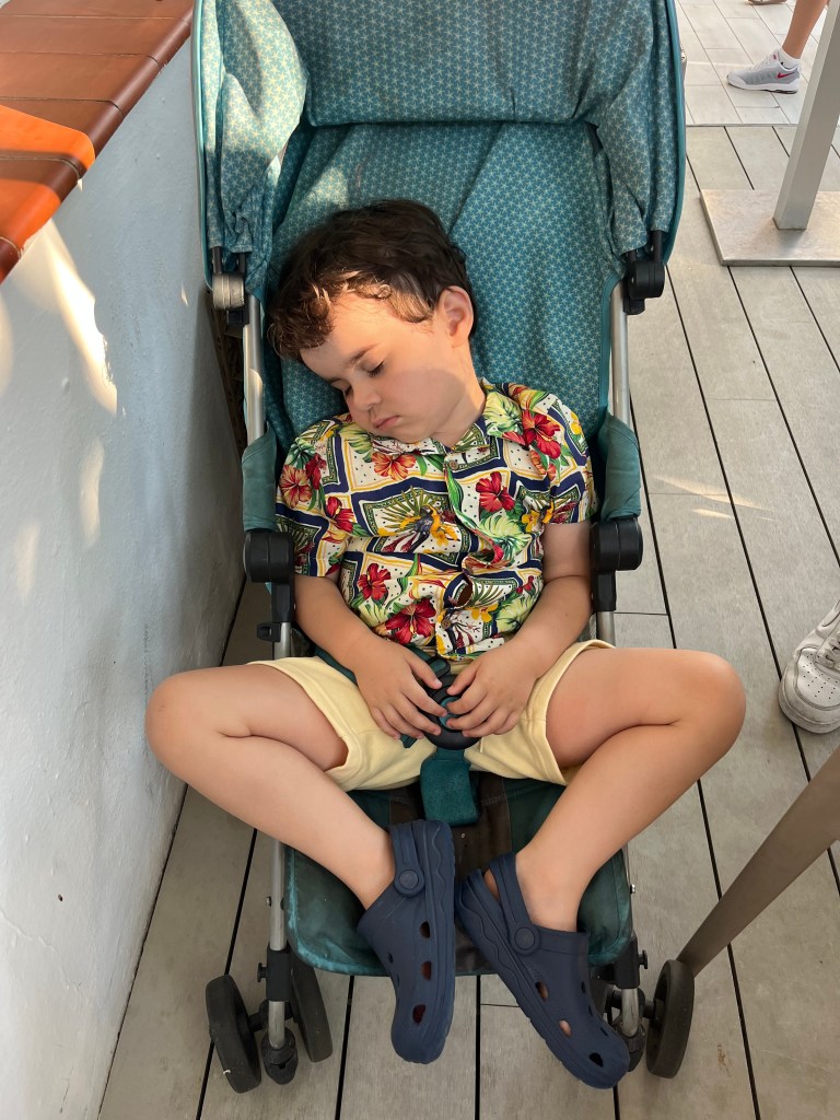 The return journey was less smooth. Everything was now sandy and so were we. I was grateful for the pushchair, which was already filthy enough that sea water and grit could only improve it. Back at the hotel, a minor miscommunication meant I ended up showering two sandy children alone while Kike sat at the snack bar thinking we’d meet him there.