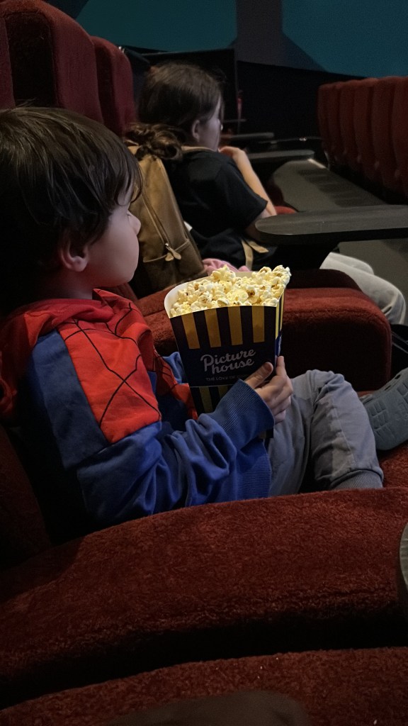 He sat for about ten per cent of it, ran around, climbed seats, shouted when I touched his popcorn box but he was happy.