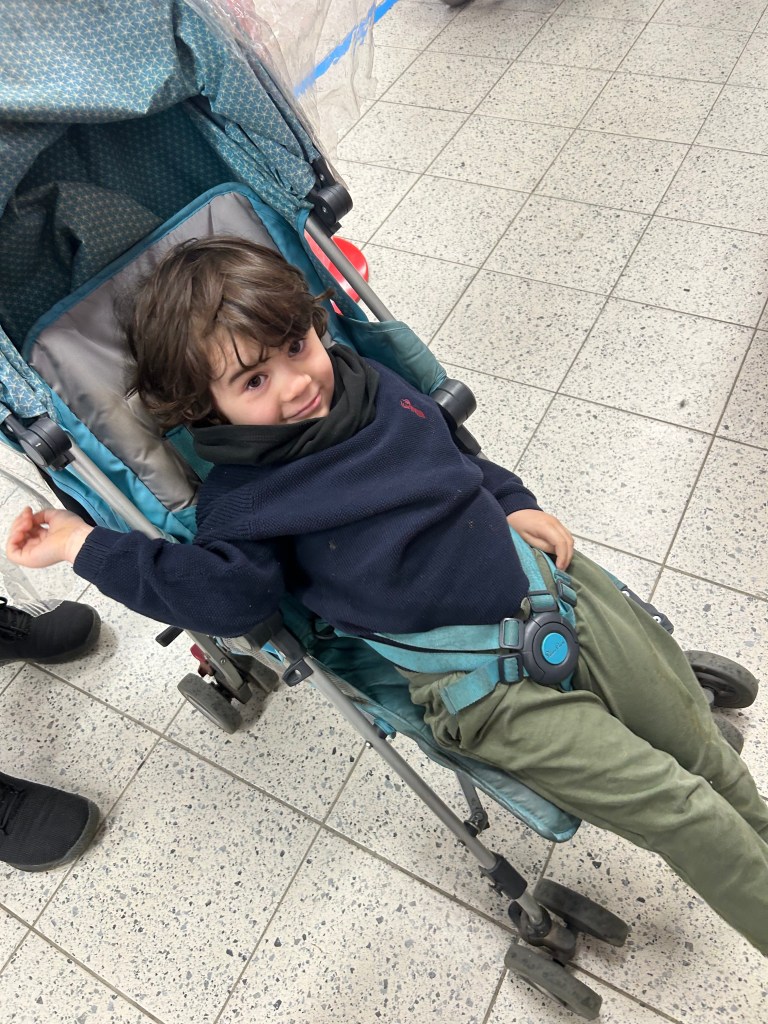 We made it to the plane in mostly one piece. I was very glad we brought the pushchair.